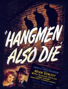 On May 27, 1942 the Nazi Reichsprotector of Bohemia/Moravia, the "Hangman" Reinhard Heydrich, died from the bullets of unidentified resistance fighters. Hangmen Also Die is the story of Heydrich's assassination in fictionalized form. It was Bertolt Brecht's only comparatively successful Hollywood project; the money he received allowed him to write "The Visions of Simone Marchand", "Schwyk in the Second World War" and his adaptation of Webster's "The Duchess of Malfi". Hanns Eisler won an Academy Award for his musical score.